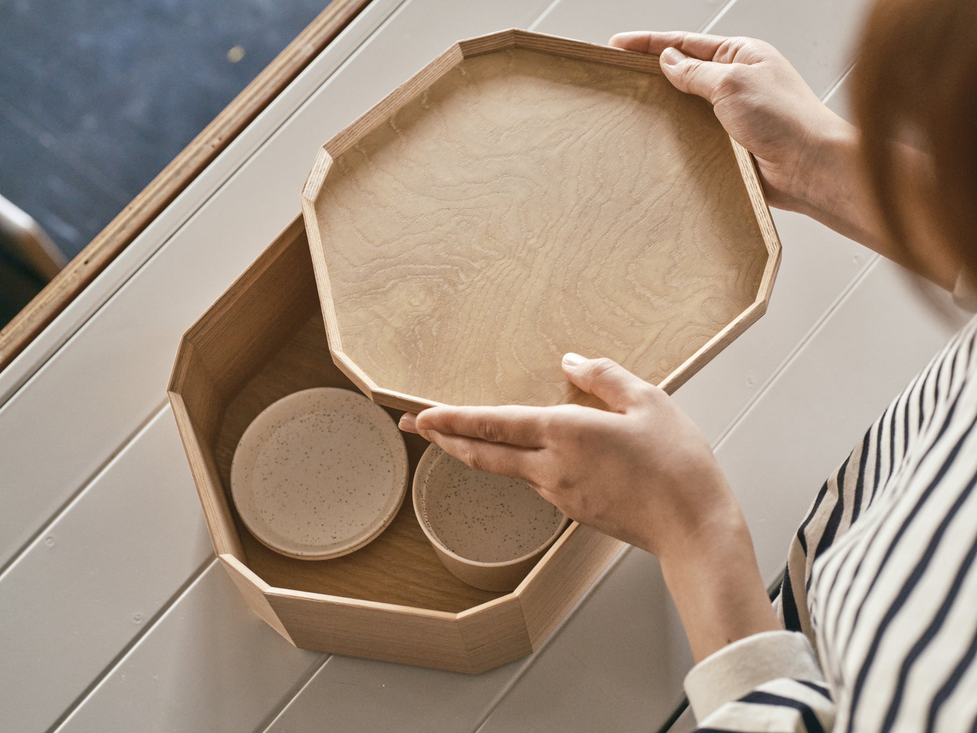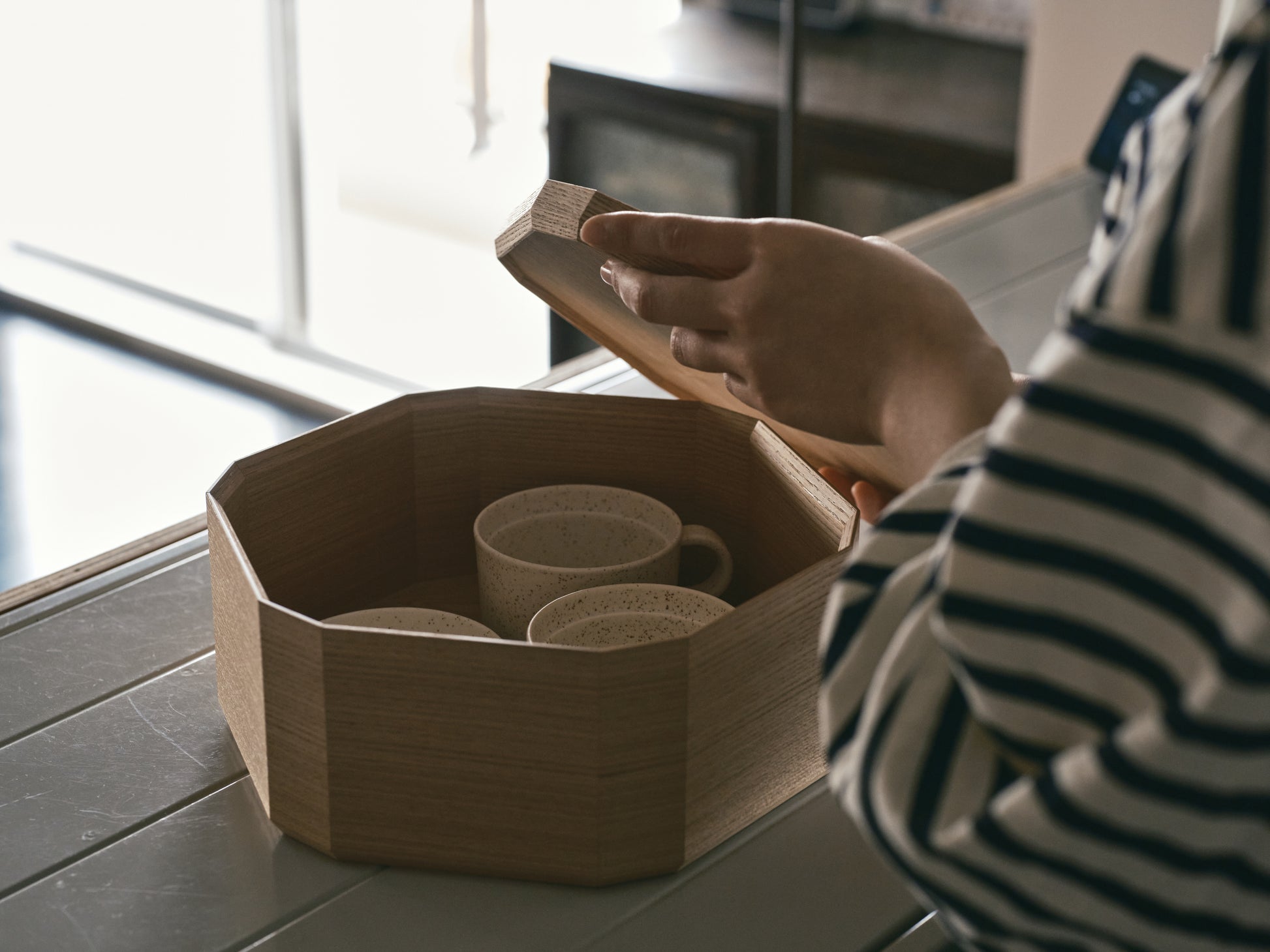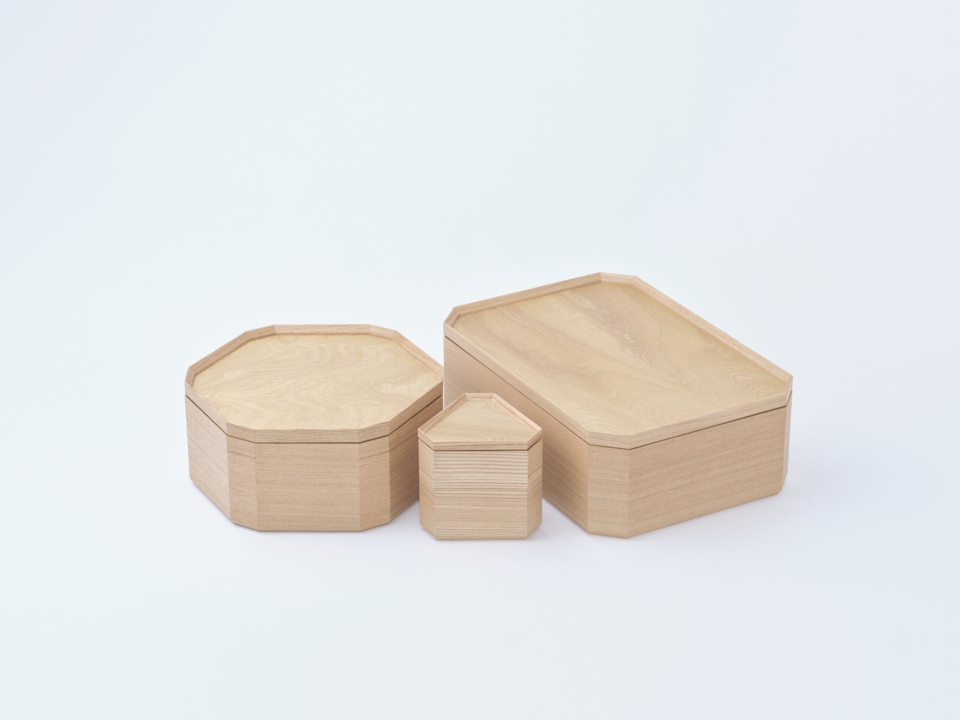 それぞれ同じ形状のものを積み重ねていけば、重箱や蓋つきのボックスのように。使う場所やシーンに合わせてしなやかに役割を変えながら、日々の暮らしにそっと寄り添います。